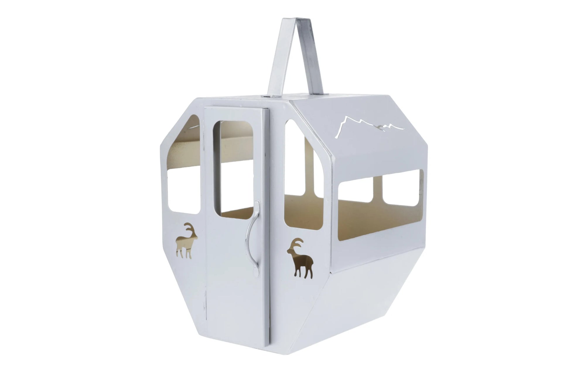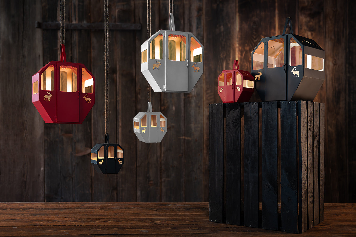 Schweizer Gondeln stehen für Sonntagsausflug, Erlebnis, Entspannung. Dank Ihnen schweben oder ruckeln wir in die Höhe. Die Aussicht wird dabei immer grandioser. «Lumières des Alpes», der Spezialist für Deko-Produkte mit Alpencharme, liess sich im Seilbahn-Museum in Kandersteg zu dieser speziellen Laterne inspirieren. Hergestellt aus Metall, erhalten die Gondeln in präziser Handarbeit ihren letzten Schliff.