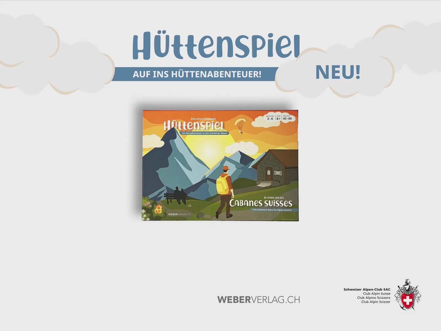 Das unterhaltsame Würfelspiel für zwei bis sechs berg- und hüttenbegeisterte Spielerinnen und Spieler ist ab acht Jahren geeignet. Auf der Wanderung erfährt man viel Interessantes über die SAC-Hütten und die Privathütten – alle einmalig gelegen in den Schweizer Alpen.